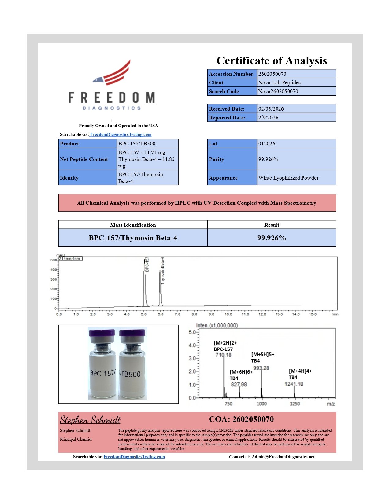 Shelf Life: Lyophilized peptides maintain stability for up to 24 months when stored properly. Use reconstituted solutions within 4-6 weeks. Form: Two separate vials, each containing white to off-white lyophilized powder